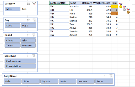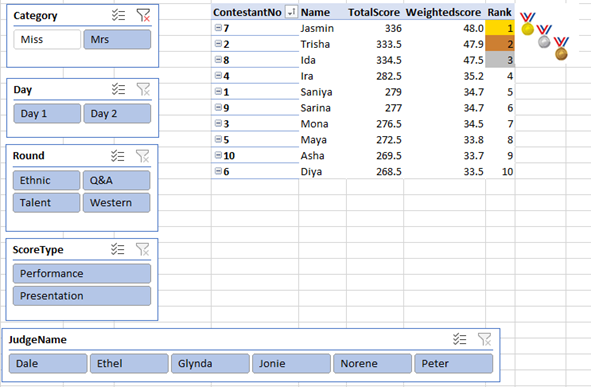 Where the pivot table has: (i) Measures: ScoreTotal, ScoreWeighted, Rank (Measures in Power Pivot are calculations used in data analysis.) (ii) Slicers: Category (Miss, Mrs), Day (Day1, Day2), Round, ScoreType (Slicersare visual filters in the form of an interactive button). It will allow the organizers to determine quickly: a) Which contestants advance to the final round? b) Who are the overall winners after the final round?